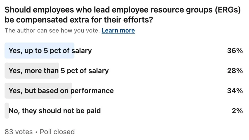 We took this question to LinkedIn and by and large, the answer is yes. What that compensation looks like may vary, but the sentiment remains the same. If you want to make your employees feel seen, heard, and valued as an ERG lead, you need to think of ways to weave this role into performance reviews and promotions. The extra work that ERG leads put in to drive your DEI mission is invaluable.